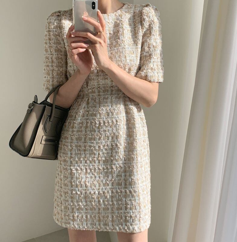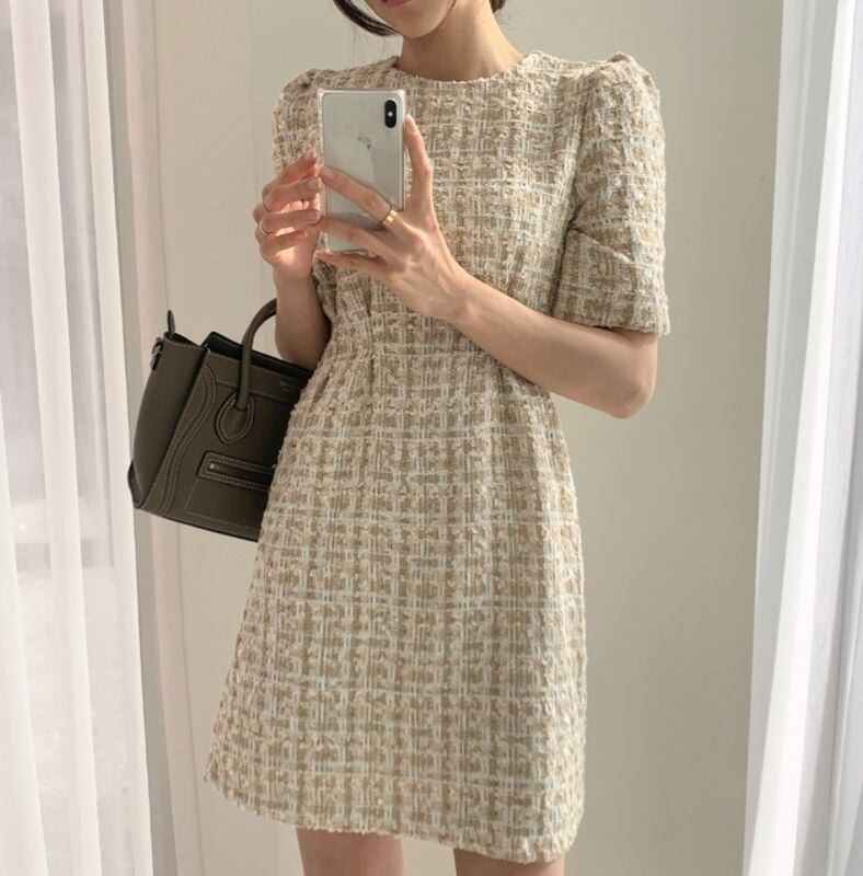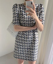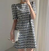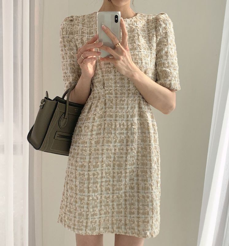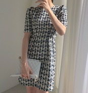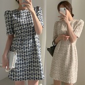 パワショル 半袖 パフ スリーブ ツイード ミニ ワンピース 韓国 [gg-2135]