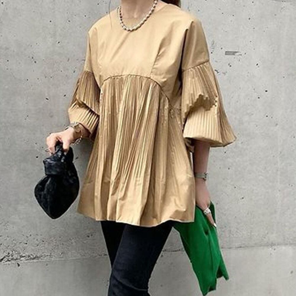 プリーツ フレア ブラウス トップス ランタンスリーブ 半袖 韓国 [gg-2181]